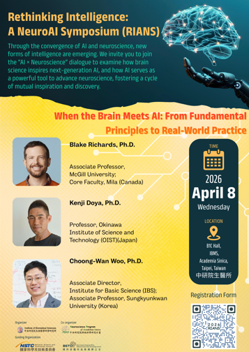 為持續推動此領域之發展,國科會腦科技專案推動辦公室將於115年4月8日(星期三),假中央研究院生醫所舉辦 「Rethinking Intelligence: A NeuroAI Symposium (RIANS)」 國際學術交流會。