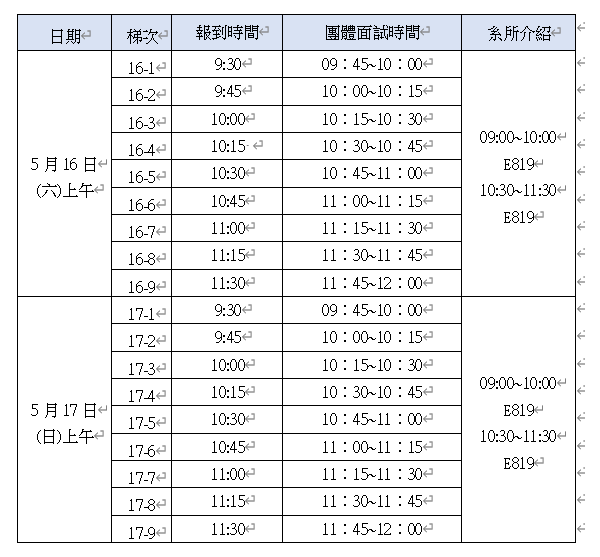 六、各梯次團體面試時間前15分鐘請至面試報到暨等候室(新工學大樓教室E819室)等候。 依