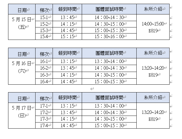六、各梯次團體面試時間前15分鐘請至面試報到暨等候室(新工學大樓教室E819室)等候。 依